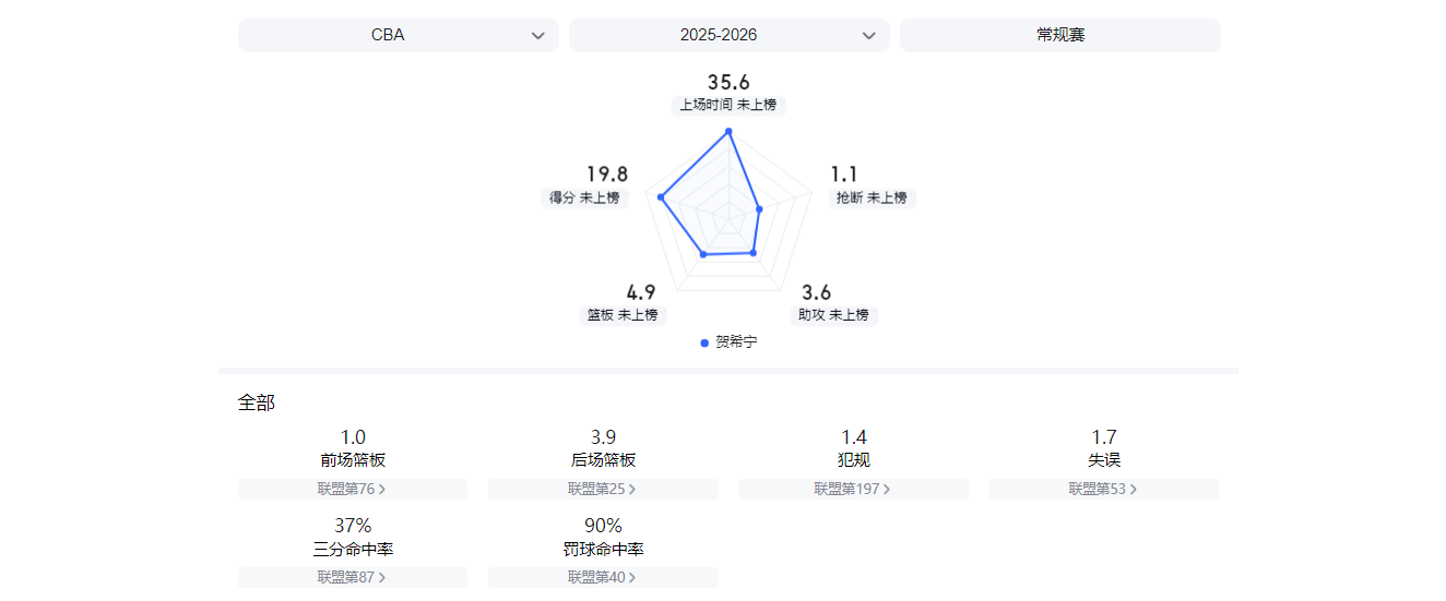 在面对联盟豪强时,贺希宁也能打出球星数据。两战北京男篮,他一场砍下27分,一场贡献17分;对阵广东男篮和上海男篮,他分别为球队贡献24分和25分。